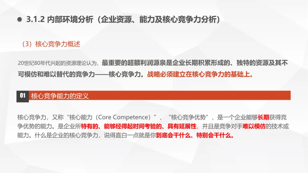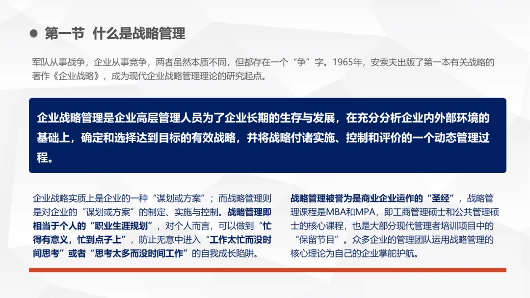 战略管理的定义:是企业高层管理人员为实现长期生存发展,在分析内外部环境基础上,确定并实施有效战略,进行动态控制与评价的过程,相当于企业的 “职业生涯规划”,是 MBA 核心课程与企业管理的 “圣经”。