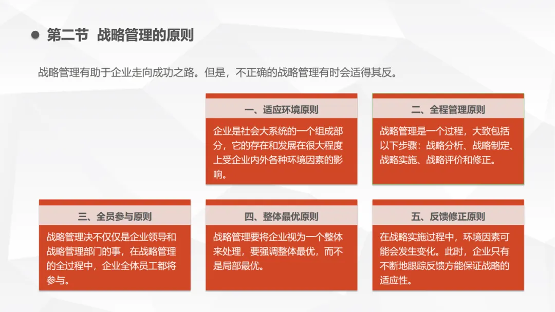 战略管理的五大原则:一是适应环境原则,企业需顺应内外部环境变化;二是全程管理原则,覆盖战略分析、制定、实施、评价与修正全流程;三是全员参与原则,战略管理并非仅高层职责,需全体员工参与;四是整体最优原则,强调企业整体效益最大化而非局部最优;五是反馈修正原则,动态跟踪环境变化,及时调整战略。
