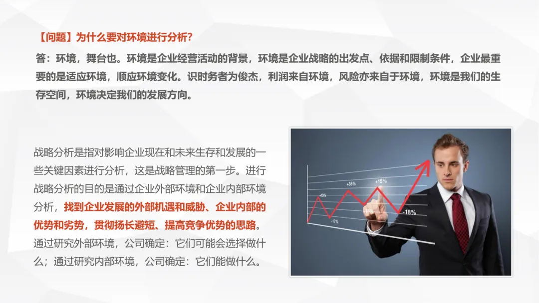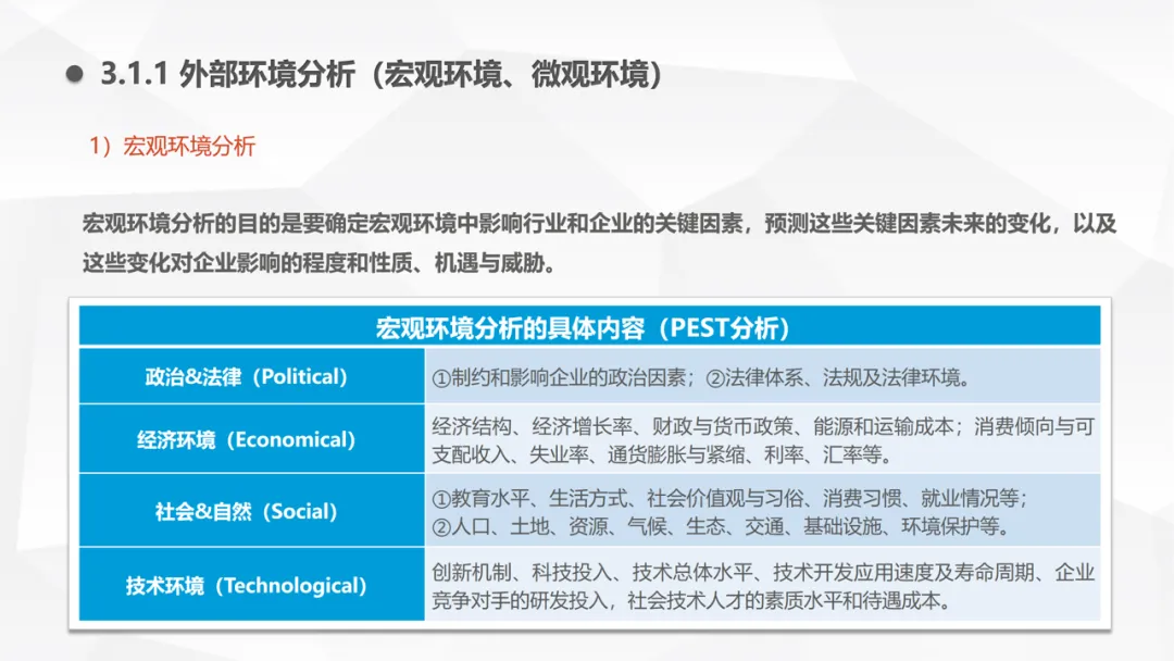 外部环境分析:宏观环境采用 PEST 分析法,涵盖政治法律、经济、社会自然、技术四大维度;微观环境运用波特 “五种力量模型”,分析新进入者威胁、现有同行竞争、供应商议价能力、客户砍价能力、替代品威胁,哈默根据美国禁酒令废除趋势布局酒桶业务,是外部环境分析的经典案例。