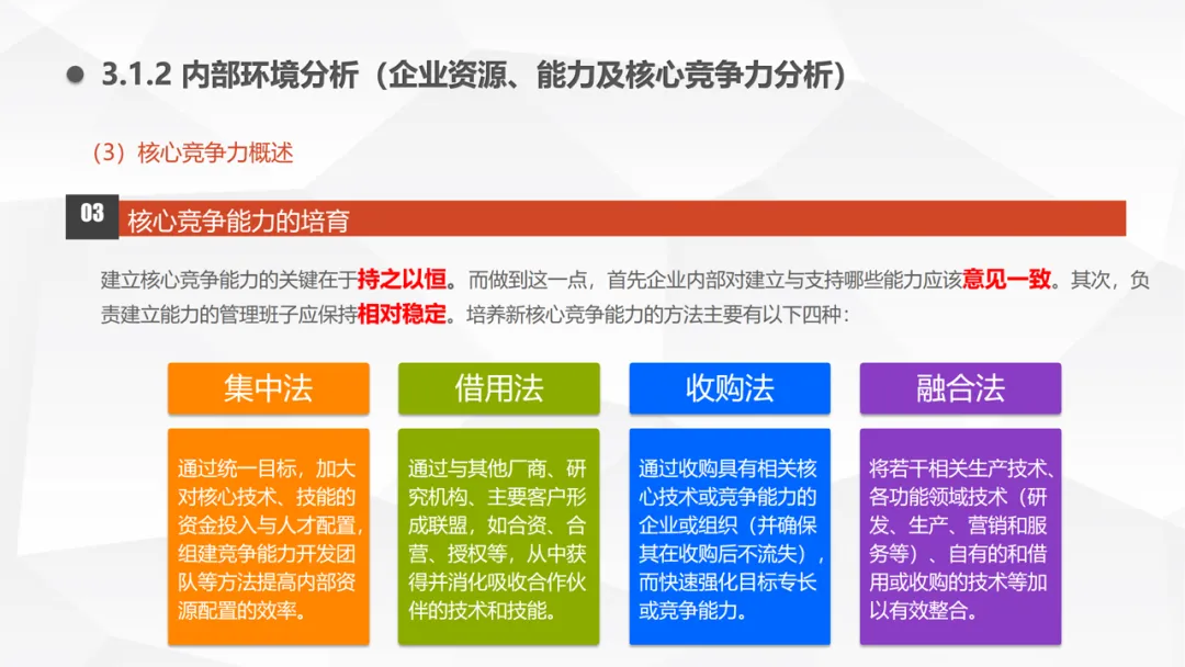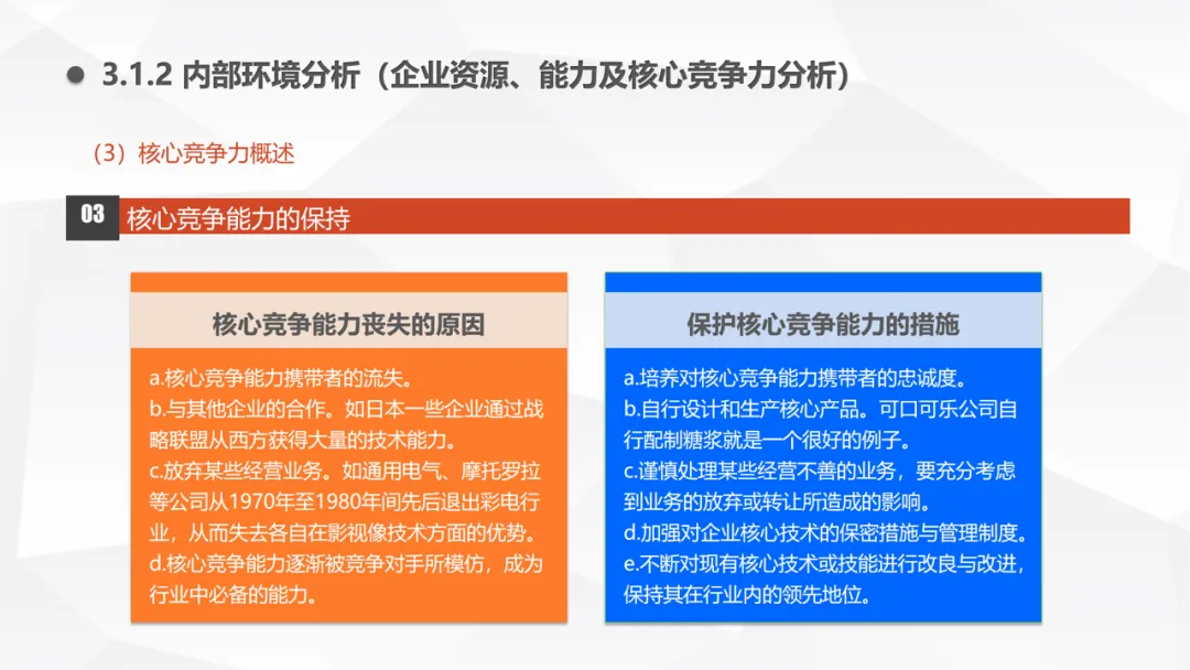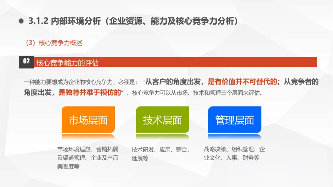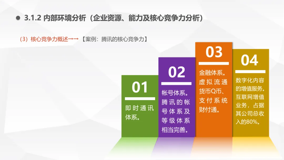 内部环境分析:通过价值链分析梳理生产经营活动,识别资源(有形与无形生产要素)与能力(资源整合技能),聚焦核心竞争力 —— 企业长期积累的、独特且难以模仿的技术或能力,腾讯的即时通讯体系、数字化增值服务等构成其核心竞争力。