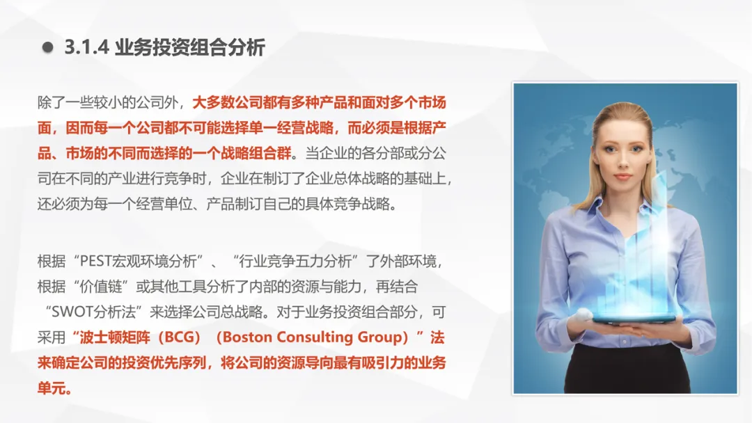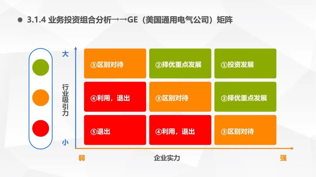 内外结合分析:运用 SWOT 分析法,组合形成 SO(增长型)、ST(多种经营型)、WO(扭转型)、WT(防御型)四大策略,为战略选择提供依据;通过波士顿矩阵、GE 矩阵进行业务投资组合分析,优化资源配置。