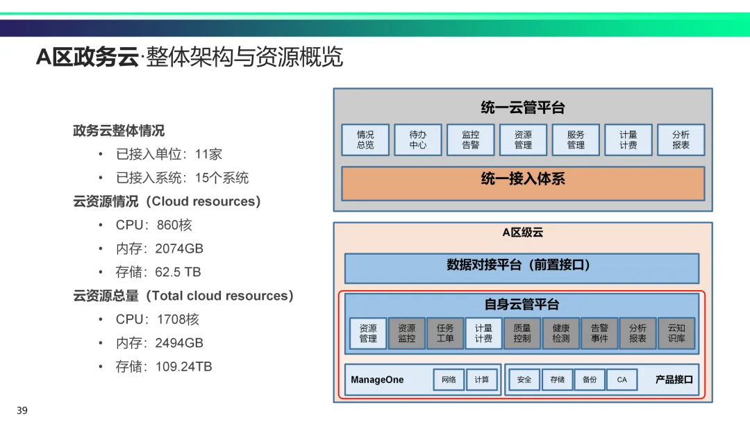 统一云管理平台是政务云平台的“智慧大脑”。它通过对云资源的统一管理和调度,实现了云服务的自动化、智能化和可视化。无论是资源分配、任务调度还是监控告警、计量计费……统一云管平台都能轻松应对、游刃有余。