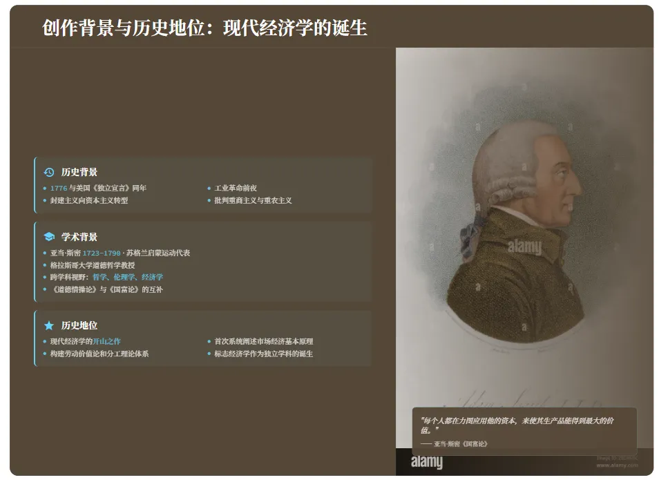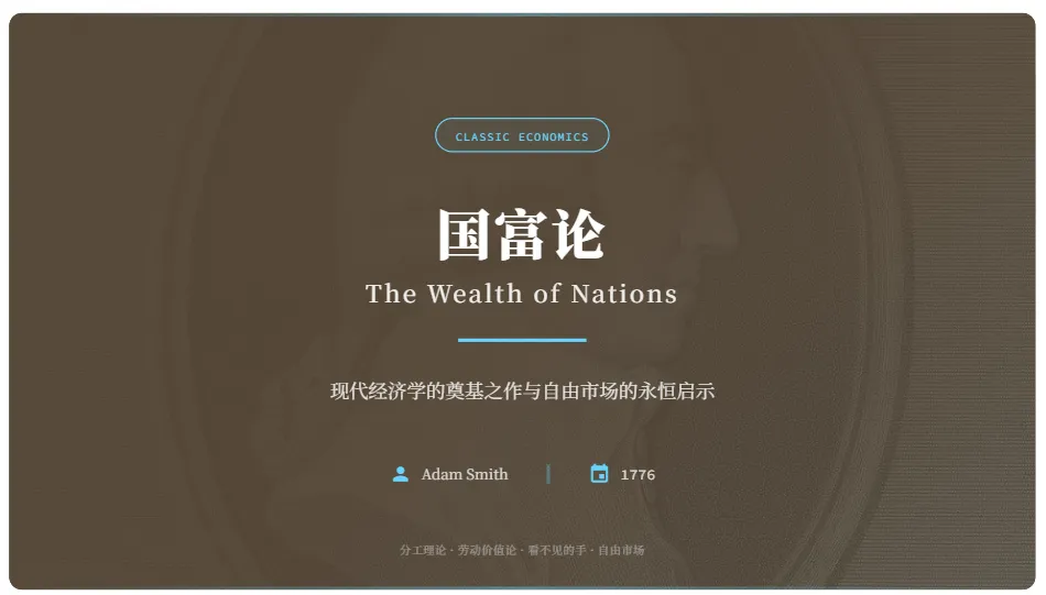 《国富论》由亚当·斯密(1723-1790)撰写,1776年与美国《独立宣言》同年出版,象征自由思想在政治与经济领域的双重突破。其创作背景是欧洲从封建主义向资本主义转型、英国工业革命前夜,当时重商主义主张贸易顺差积累金银、重农主义强调农业为财富唯一源泉,均未能正确认识分工与市场的核心作用。斯密融合哲学、伦理学与经济学视野,旨在揭示财富增长的真实机制,为新兴资本主义提供理论支撑。