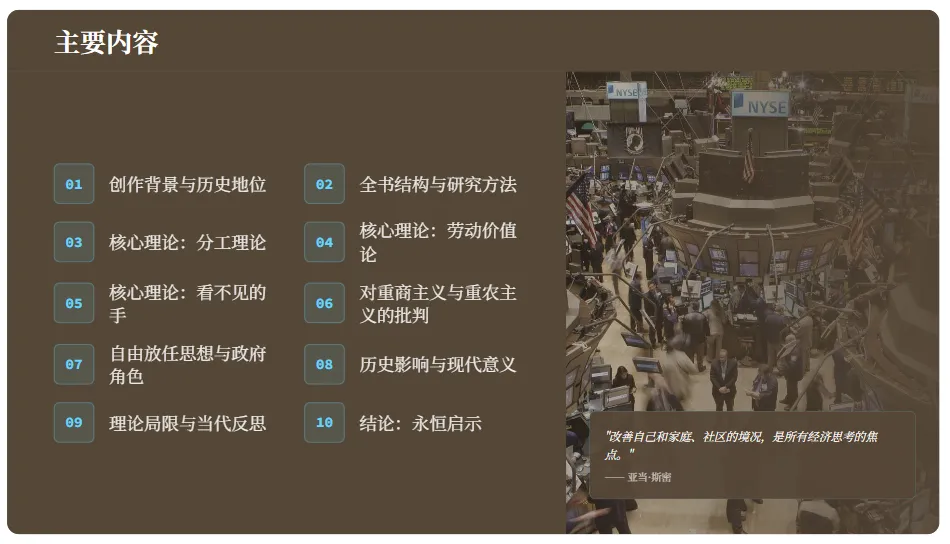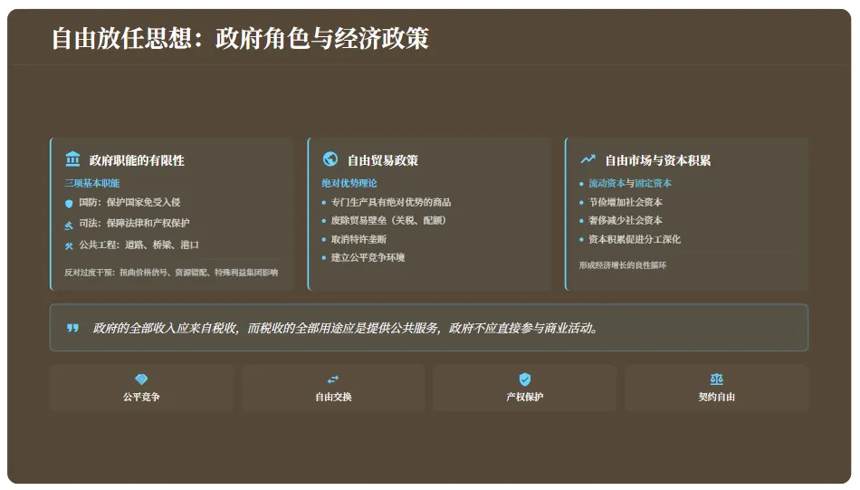 斯密主张政府职能有限,核心是国防、司法和公共工程三大职能,反对政府直接参与商业活动,倡导“自然自由制度”,强调市场在资源配置中的核心作用。他提出自由贸易的绝对优势理论,主张各国专注生产自身具有优势的商品,通过国际贸易提升整体福利,批判贸易保护主义的弊端。同时,他强调资本积累是经济增长的重要动力,储蓄是资本积累的源泉,资本应流向价值创造能力强的部门。
