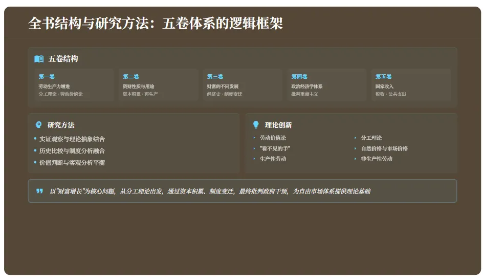 《国富论》共五卷,形成严密逻辑体系:第一卷阐述分工、劳动价值论;第二卷分析资本积累与用途;第三卷探讨制度变迁与财富发展;第四卷批判重商主义与重农主义;第五卷论述政府收入与职能。全书以“财富增长”为核心,构建了从微观到宏观、从理论到实践的完整框架。