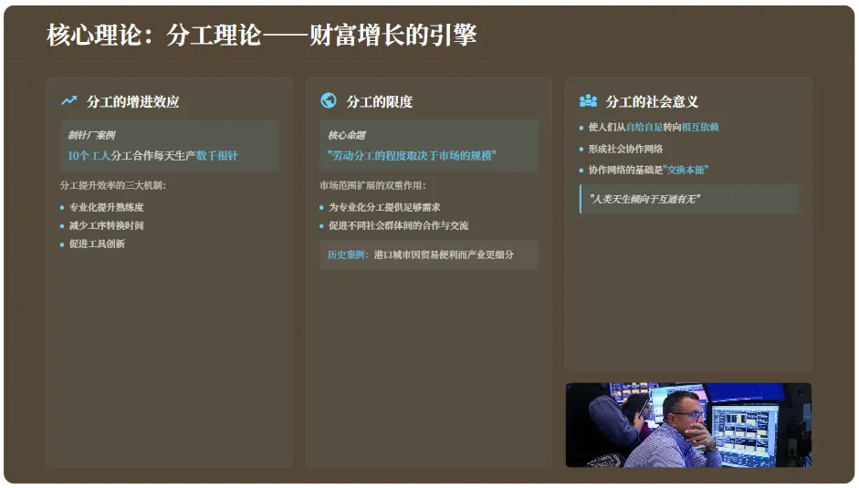 分工理论是《国富论》核心支柱,斯密以制针厂为例,说明分工通过提升专业化熟练度、减少工序转换时间、促进工具创新,大幅提高劳动生产率;同时指出,分工限度取决于市场规模,市场扩展为专业化提供需求支撑,推动社会协作网络形成。