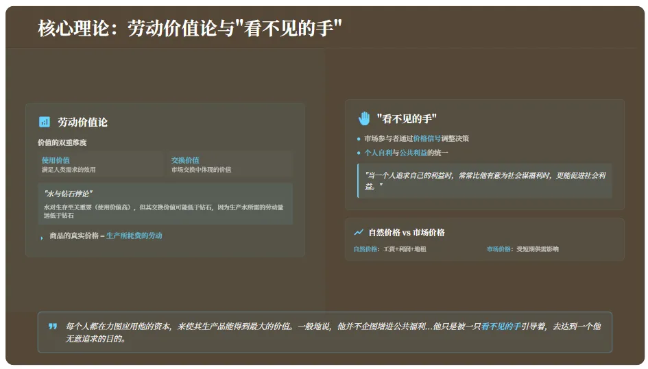 劳动价值论是价值分析的基础,斯密区分商品的使用价值与交换价值,通过“水与钻石悖论”说明交换价值取决于生产所耗劳动量,并提出自然价格(长期均衡价格)与市场价格(短期波动价格)的概念,指出市场价格长期围绕自然价格波动。