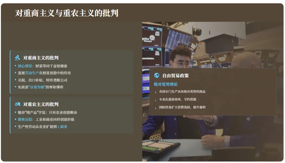 斯密系统批判重商主义,指出其将财富等同于金银、忽视劳动生产、主张政府过度干预的错误,认为关税、出口补贴等政策扭曲资源分配,本质是“以邻为壑”的零和博弈。对重农主义则辩证批判,肯定其“财富源于生产劳动”的观点,同时反驳其将财富源泉仅局限于农业的片面性,将生产性劳动扩展至工业与商业,并批判其单一农业税政策,提出公平、确定、便利、节约的税收四原则。