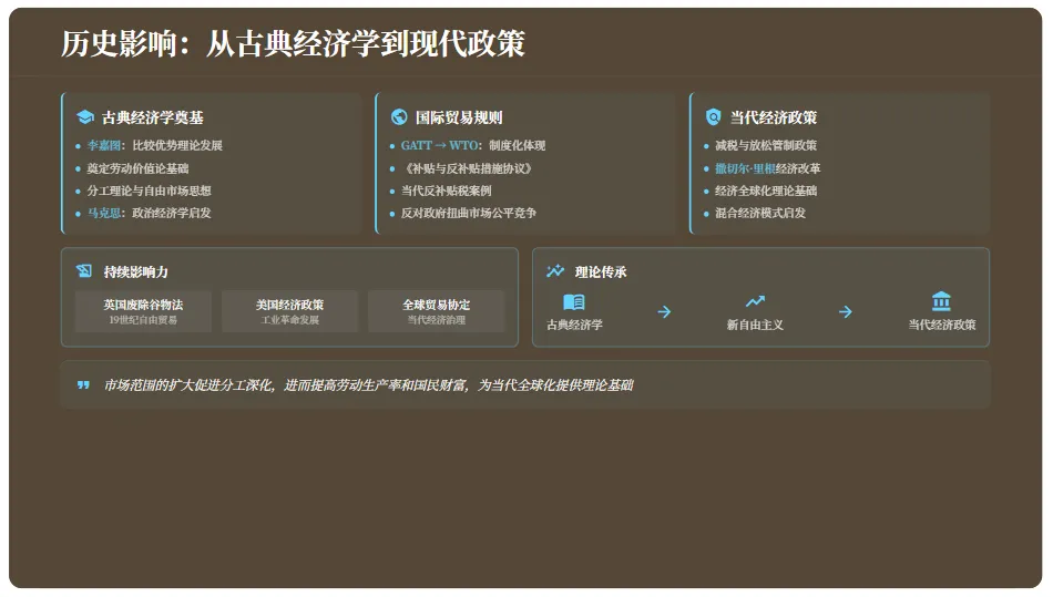 《国富论》奠定了古典经济学基础,启发李嘉图提出比较优势理论、马克思发展劳动价值论,其自由贸易思想直接影响GATT和WTO的建立,成为当代国际贸易规则的核心原则,撒切尔夫人、里根总统的经济政策均受其启发,北欧混合经济、中国社会主义市场经济也体现了其思想与政府适度干预的结合。
