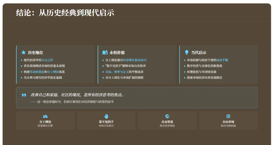 《国富论》作为现代经济学的奠基之作,斯密关于分工、市场机制和自由放任的核心思想,至今仍具有强大解释力与现实意义。尽管存在历史局限,但该书为理解现代市场经济提供了永恒思想资源,指引当代经济学在继承其合理内核的同时,不断完善理论体系、平衡市场与政府的关系。在数字经济与全球化交织的当下,斯密的理论仍为经济政策制定、国际贸易发展提供重要参照,推动市场经济向更高效、公平、可持续的方向发展。