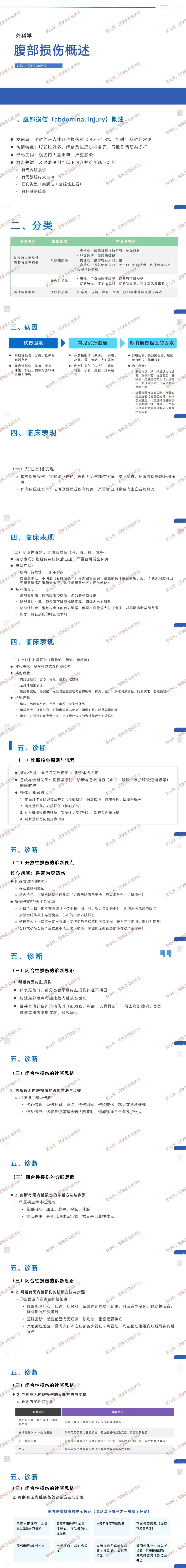 - 诊断思路:先排除其他部位合并伤,再确定是否有内脏损伤,接着分析脏器损伤类型(实质性 / 空腔性)、部位及严重程度,最后判断是否需剖腹探查。