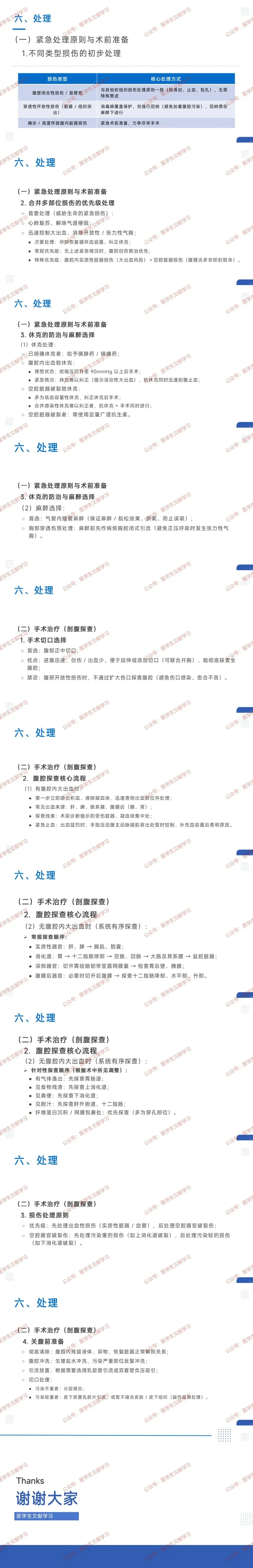- 损伤处理原则:先处理出血性损伤,后处理空腔器官破裂伤;先处理污染重的空腔器官损伤(上消化道),后处理污染轻的(下消化道)。