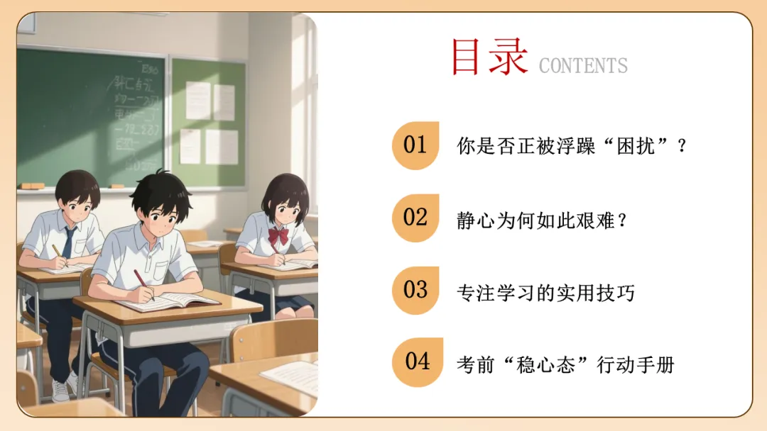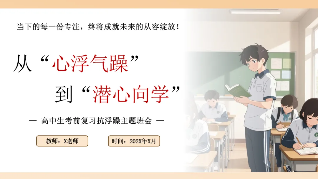 当前位置:首页>PPT>高中生考前复习抗浮躁主题班会ppt+配套文稿(从“心浮气躁”到“潜心向学”)
