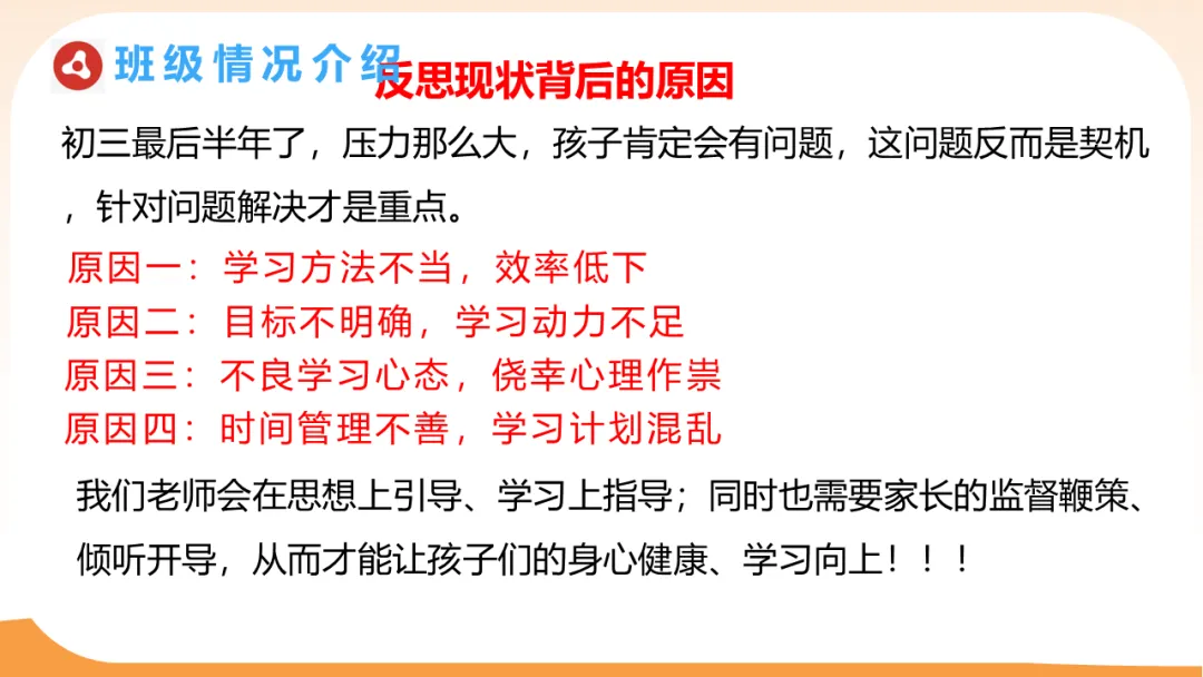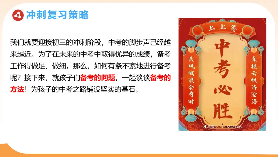 初三,是孩子们人生道路上的一个重要节点,是他们追逐梦想、迈向成功的关键一步。今天,我们相聚在这里,就是为了共同商议:如何做一个有分寸的“守望者”,帮助孩子自信迎战中考。
