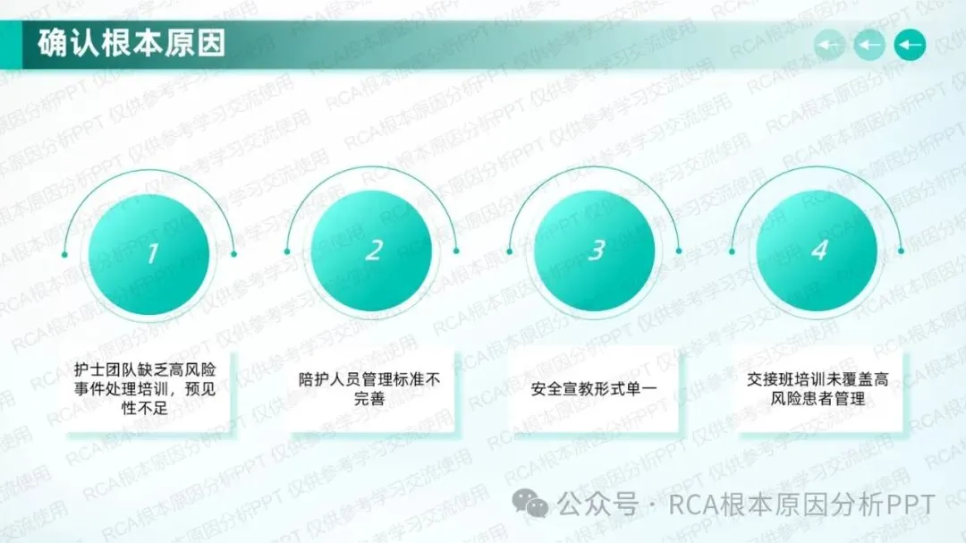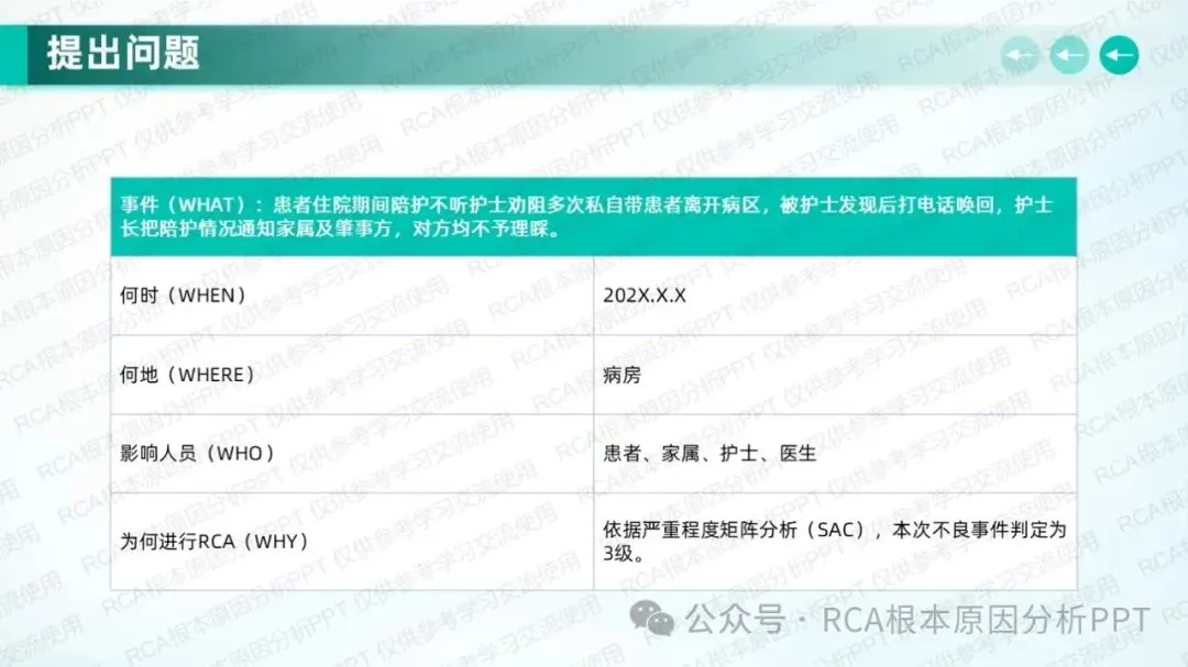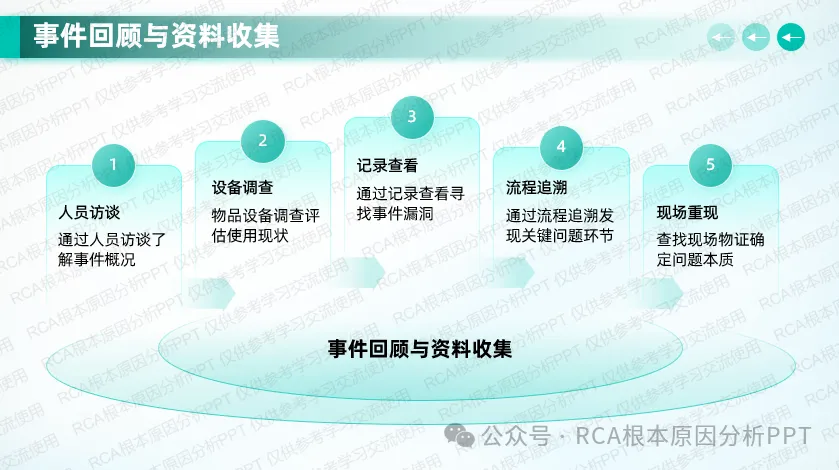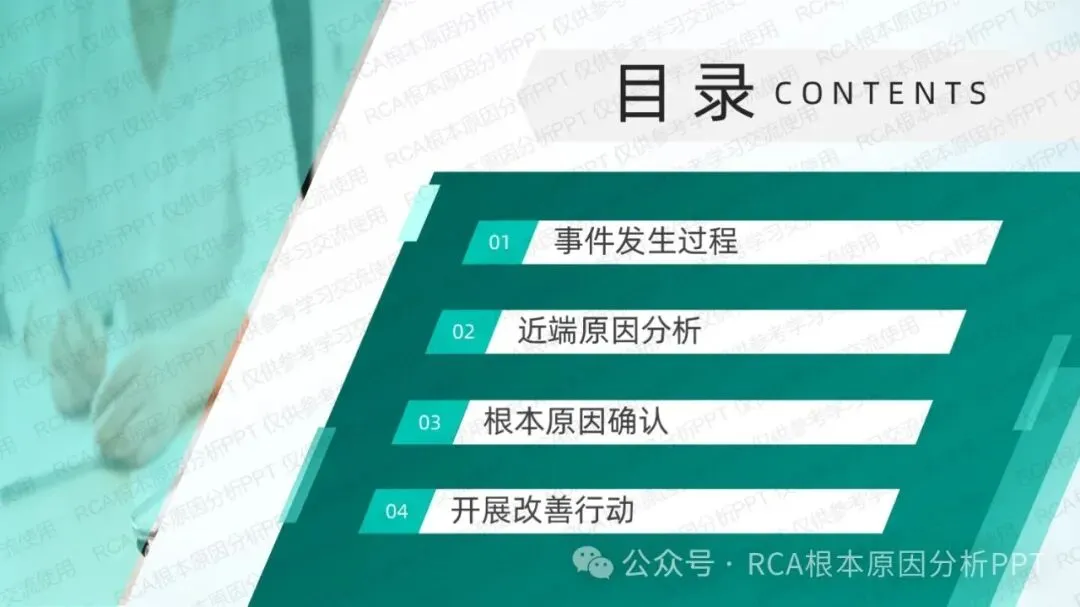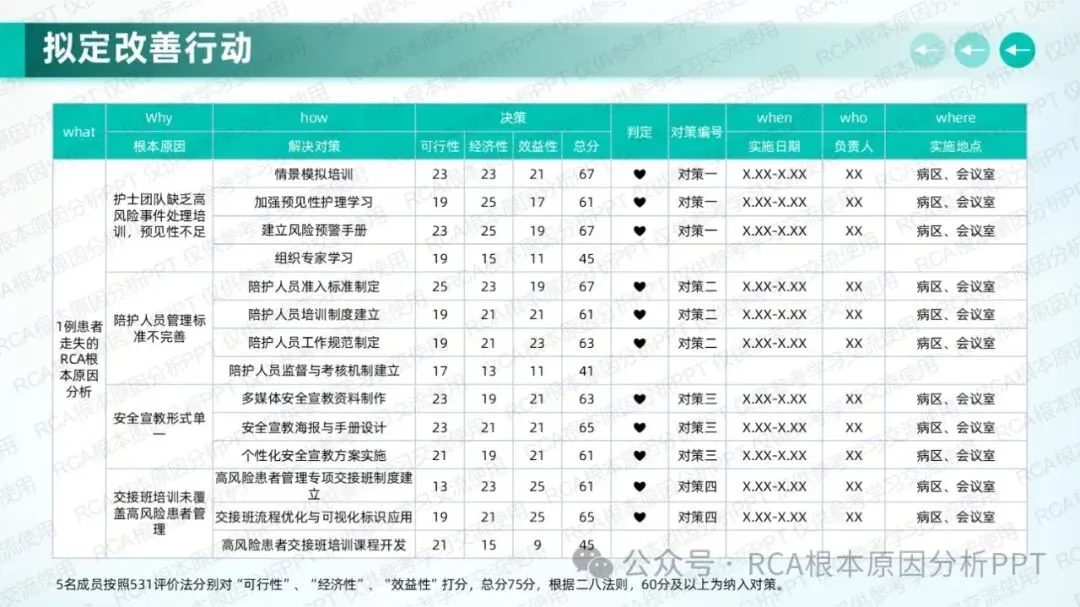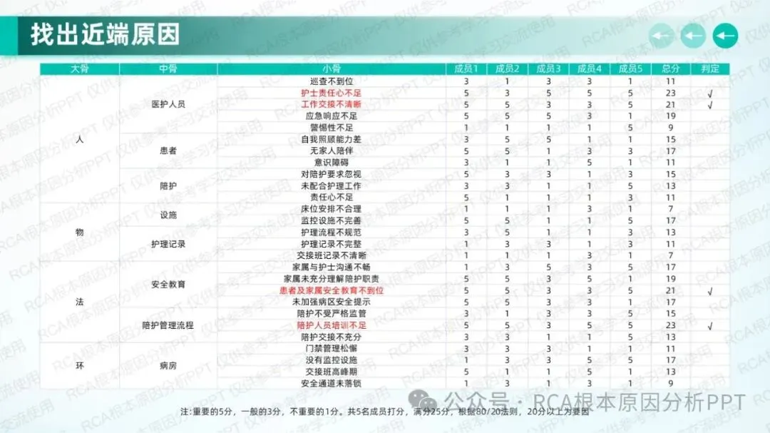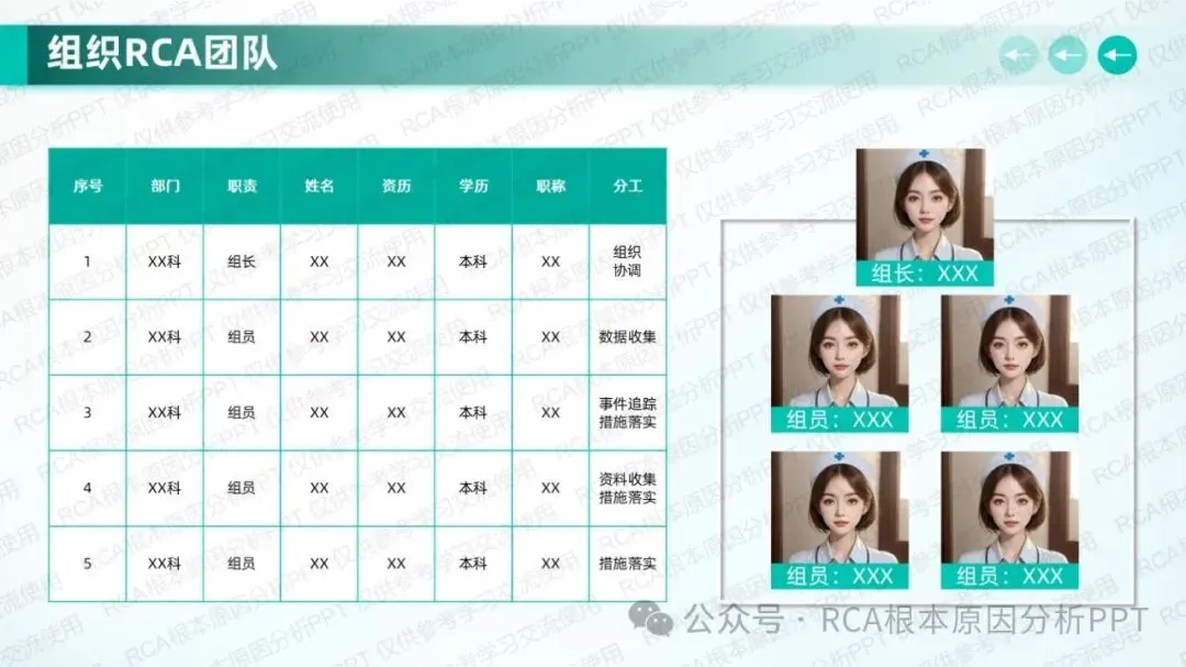 五名来自不同科室的成员组成RCA团队,每人都具备必要的RCA知识和方法,他们将共同努力达成团队的目标,并通过相互学习和激励来推动问题解决。