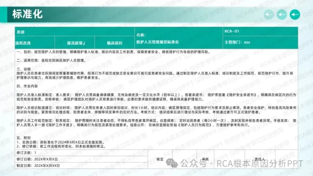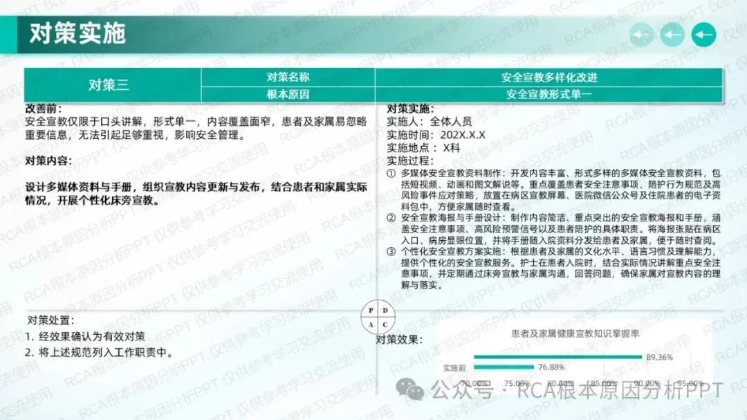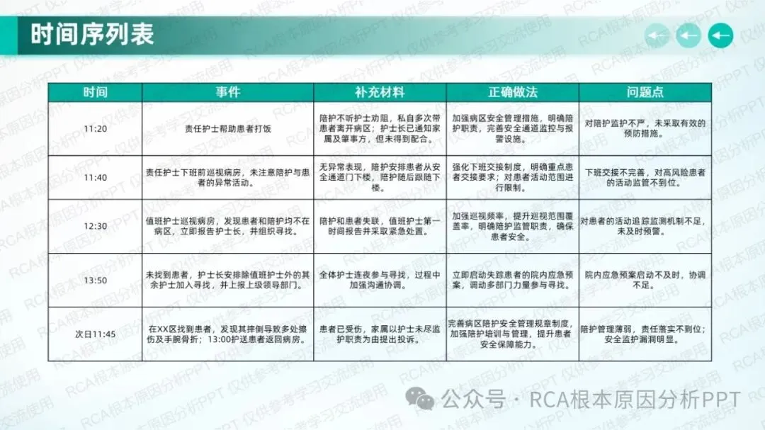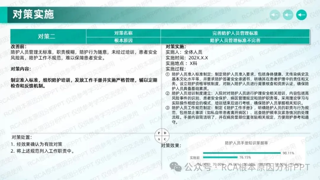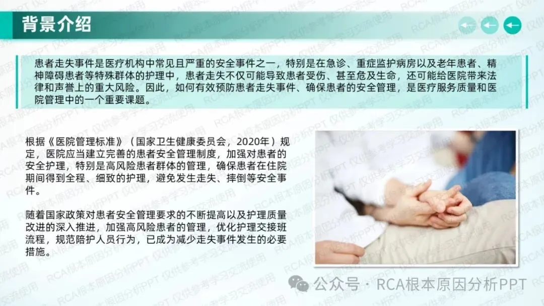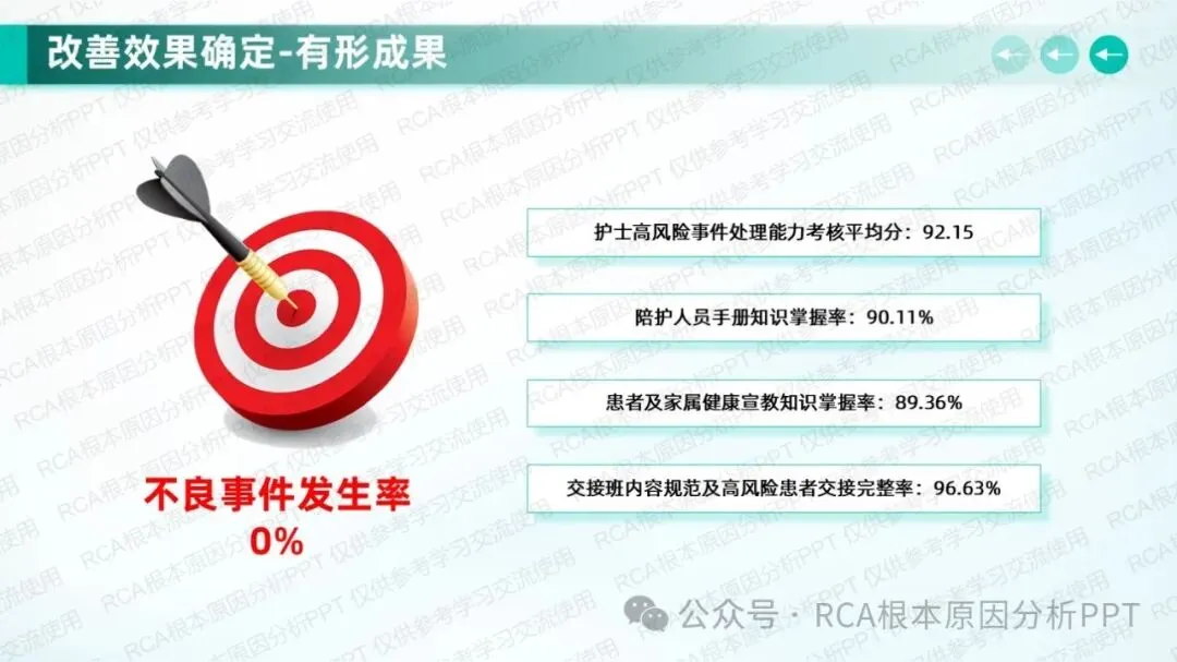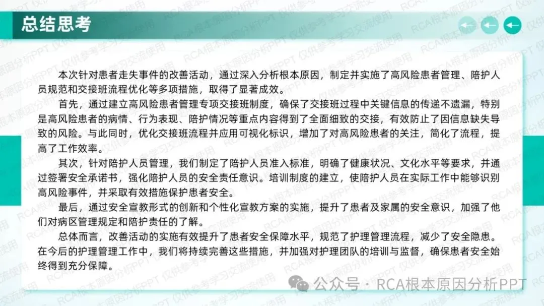 本次针对患者走失事件开展改善活动,深入剖析根本原因,制定并施行高风险患者管理、陪护人员规范以及交接班流程优化等多项措施,成效显著。