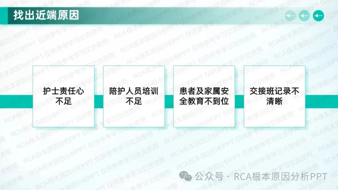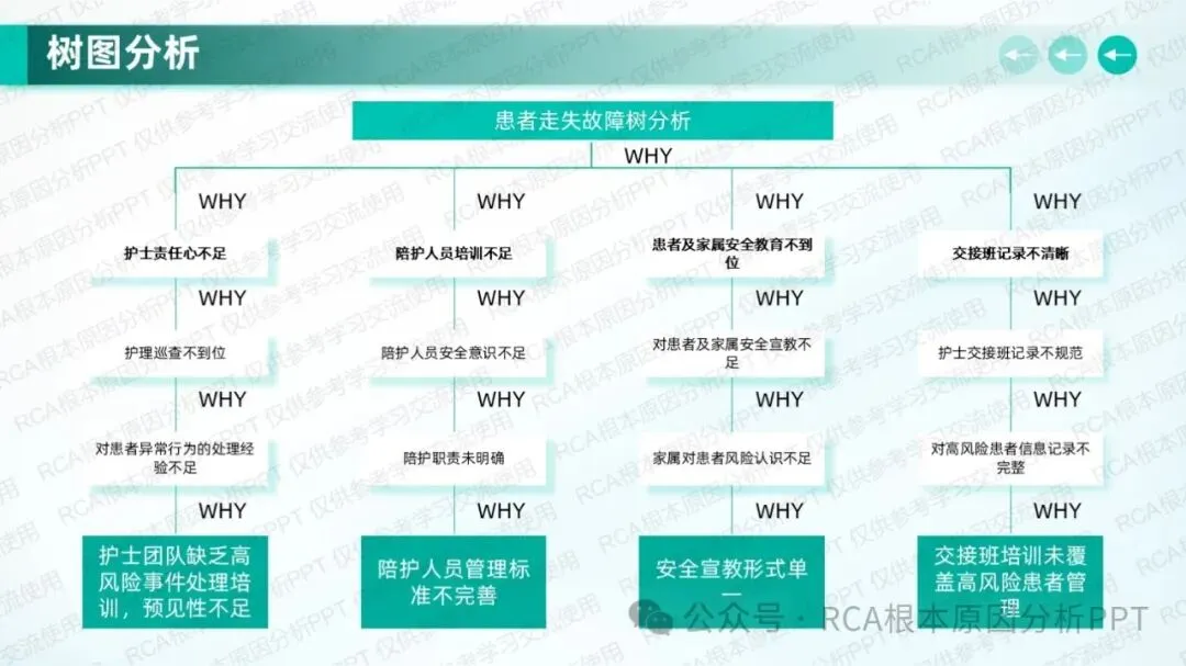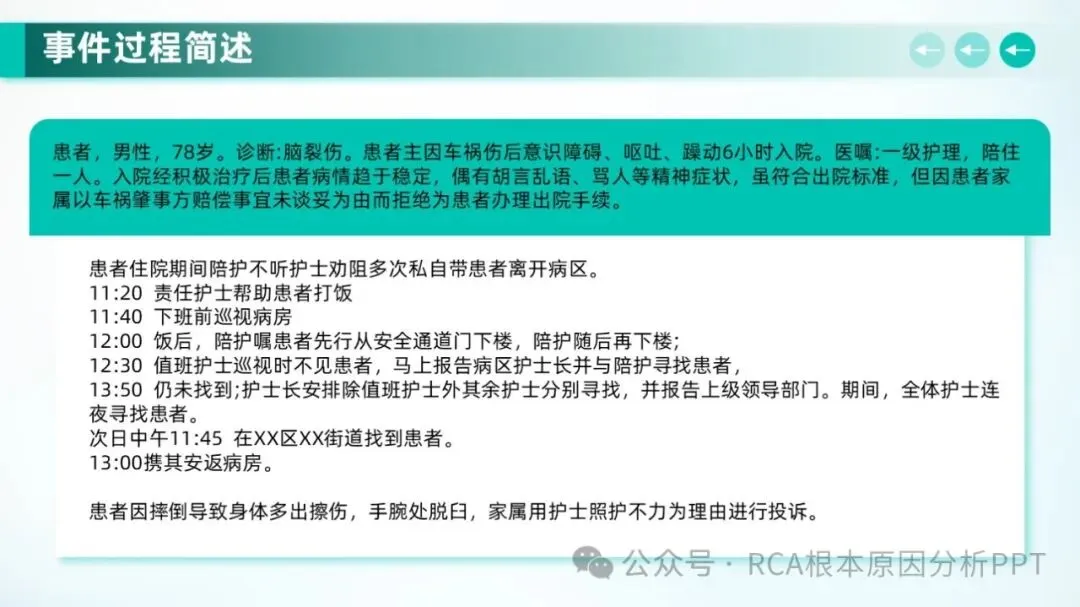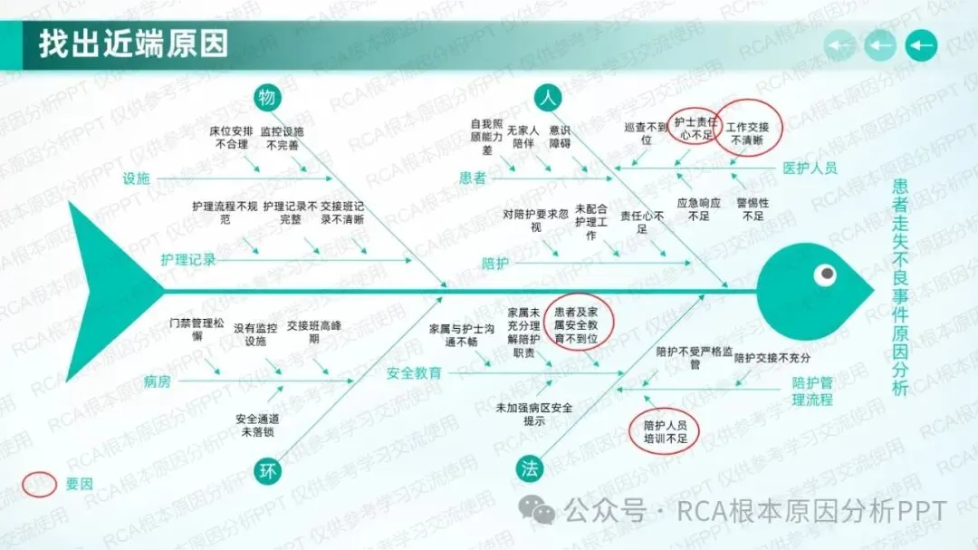 使用鱼骨图作为工具,我们将事件置于鱼头位置,从多个维度展开分支,细致探索可能导致患者走失的各种因素。