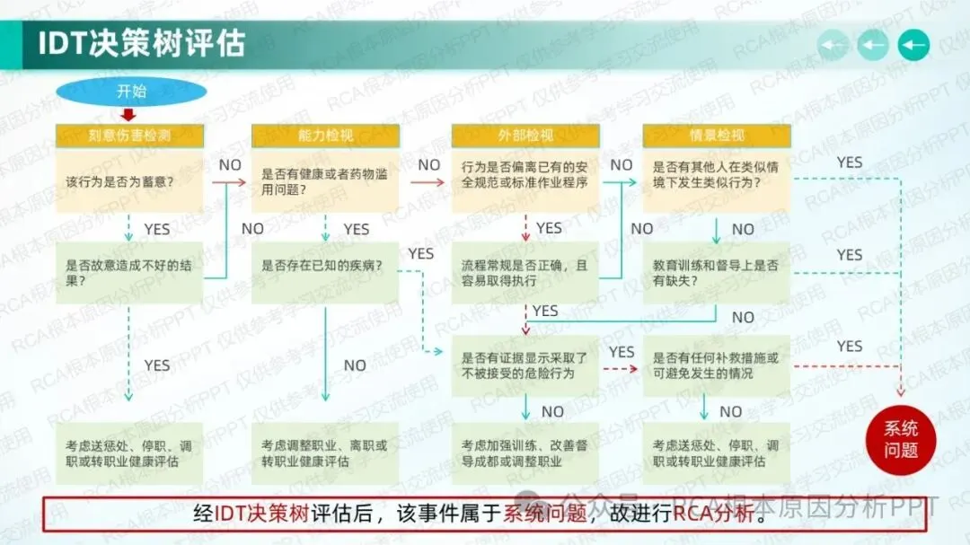 运用IDT决策树分析,判断事件是否源于系统问题。借助流程图客观审视个人与组织系统,避免简单归因。从故意伤害、能力、外部因素、环境这四个方面考量,若确认为系统问题,随即启动RCA。