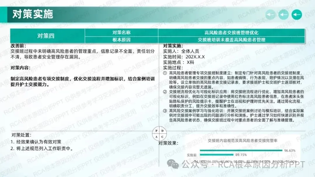 高风险交接案例学习与强化培训:组织交接班案例讨论和模拟培训,结合实际案例分析交接班中可能出现的问题并进行演练。护士通过学习快速识别和报告高风险患者状态,保证在交接班过程中全面了解并准确管理重点患者。