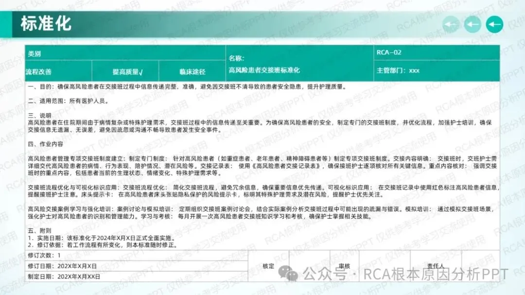 交接班流程优化与可视化标识应用:优化交接班流程,引入高风险患者可视化标识。在交接班记录里用红色标注高风险患者信息,在患者床头张贴风险提示卡,提醒护士巡视和护理时优先关注。通过简化流程、明确职责分工,提高交接效率和准确性。