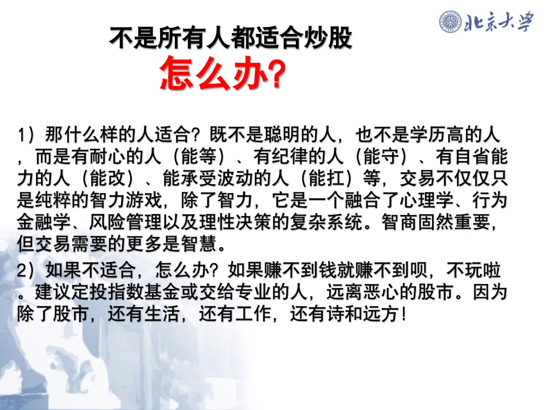 认识自己。并非每个人都适合炒股。如果发现自己无法承受波动、无法控制情绪、无法坚持纪律,应果断放弃,选择指数定投或交由专业机构管理。承认不适合,也是一种智慧。