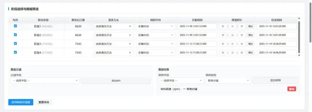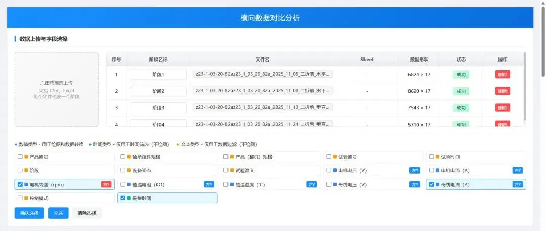 多阶段对比:将不同文件、不同系统的数据作为独立阶段,一键勾选需要对比的阶段,系统自动生成多曲线对比图