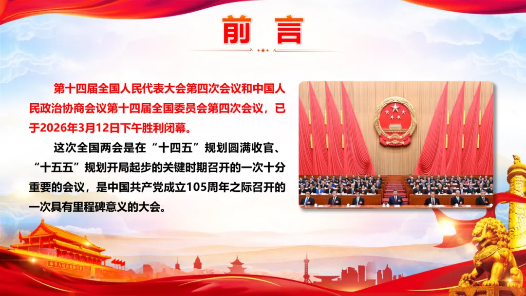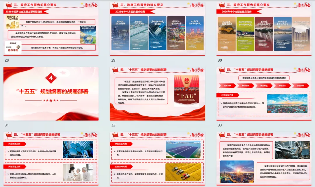 最新PPT《2026年全国两会精神传达》学习资料,全面梳理两会核心成果,内容完整覆盖三场重要讲话、政府工作报告十大任务、“十五五”规划纲要战略部署以及重要法律草案关键要点。