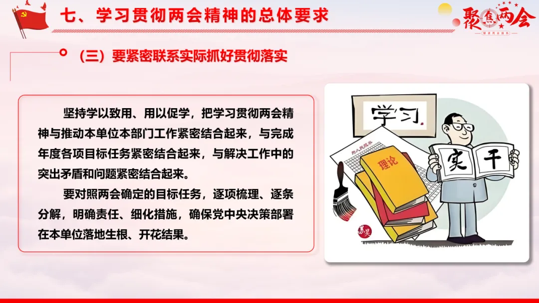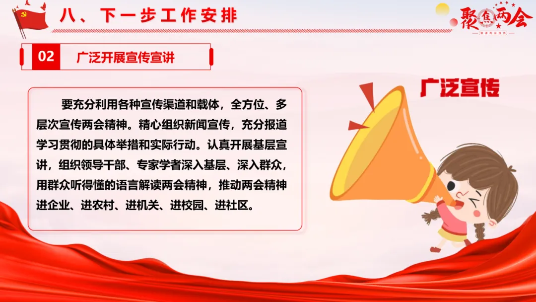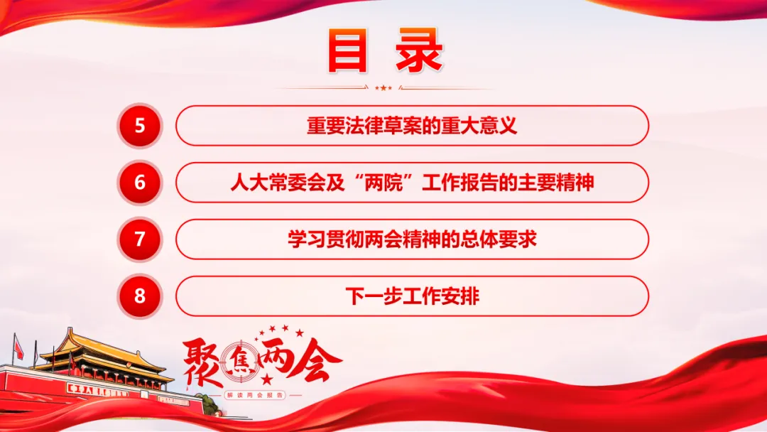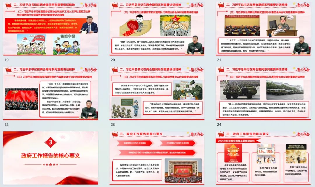 页面设计得很用心,图文并茂,逻辑清晰,内容准确,是各单位开展两会精神传达学习的理想材料。PPT共55页,配套讲稿7200字,完整包含八个部分,详情见下图,适合各级单位使用。