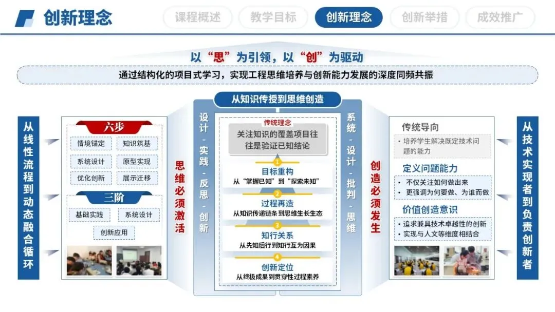 在“创新理念”部分,PPT用四组“从……到……”的对比,清晰呈现了教学思想的转变: