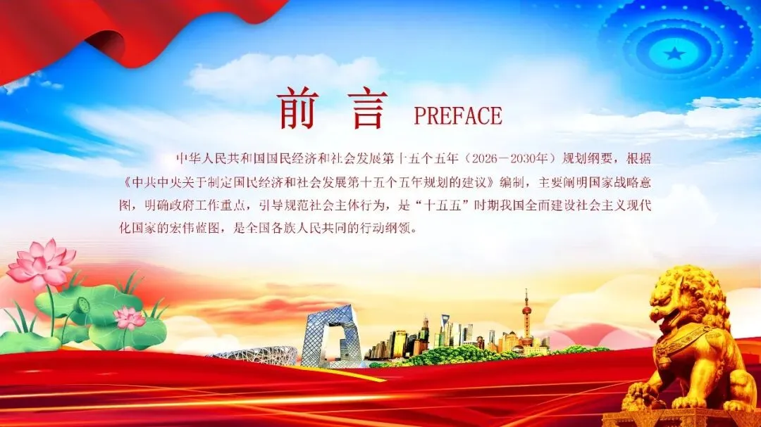 中华人民共和国国民经济和社会发展第十五个五年(2026-2030年)规划纲要,根据《中共中央关于制定国民经济和社会发展第十五个五年规划的建议》编制,主要阐明国家战略意图,明确政府工作重点,引导规范社会主体行为,是“十五五”时期我国全面建设社会主义现代化国家的宏伟蓝图,是全国各族人民共同的行动纲领。