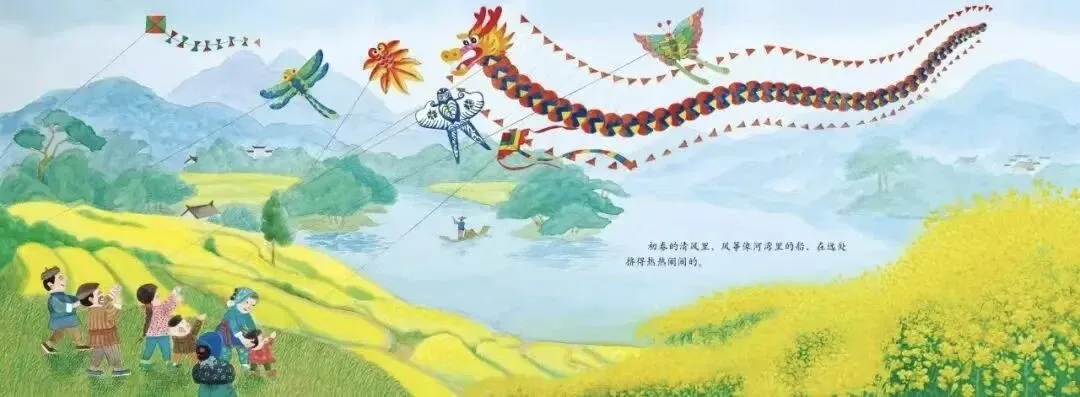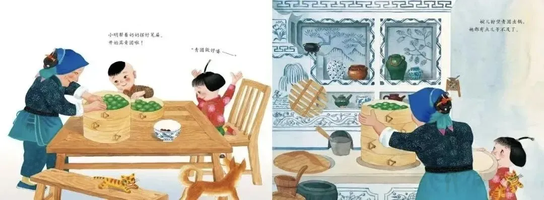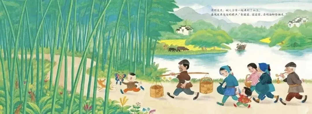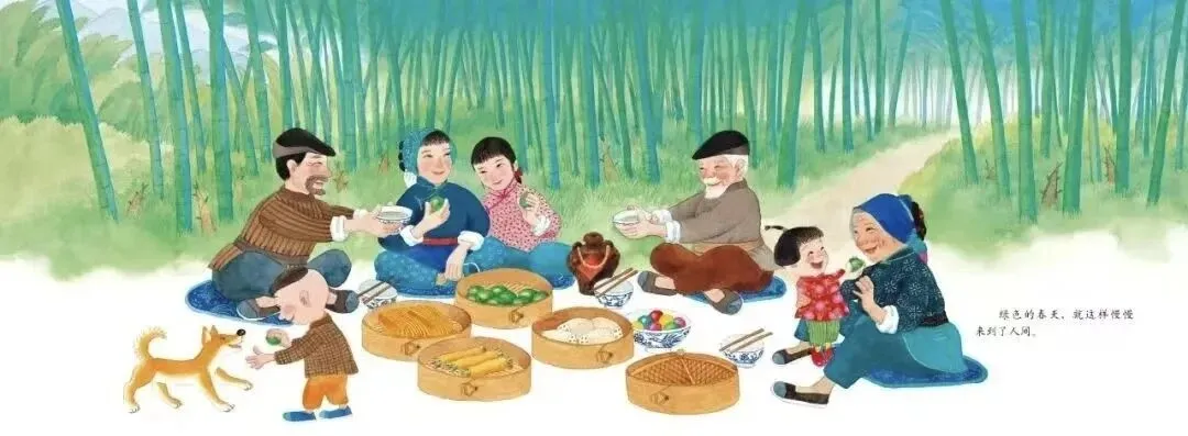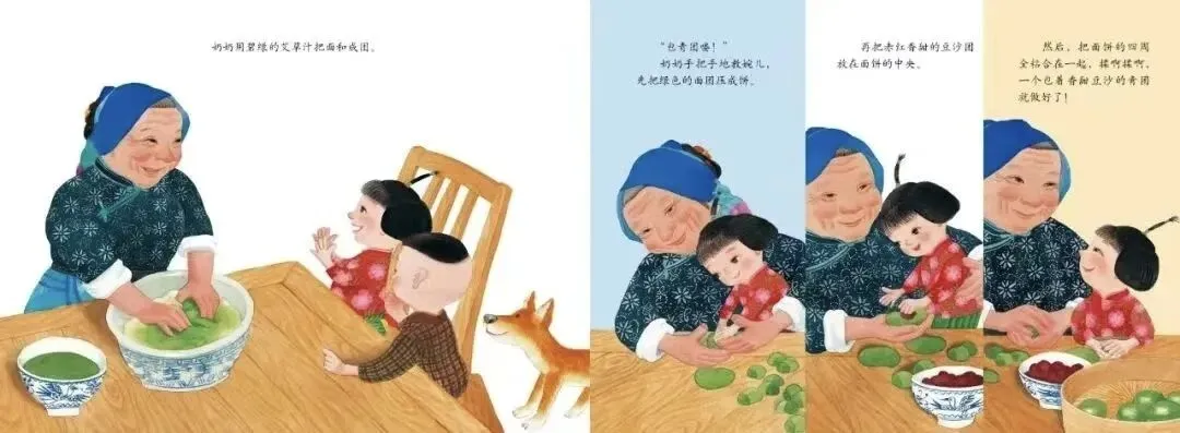 故事里,奶奶用艾草汁揉出绿色面团,包上豆沙馅做成青团;青团先祭祖,再全家分享;一家人还去扫墓、踏青、放风筝,感受春日与亲情。