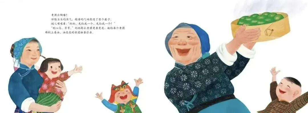 这时,门外一阵热闹声传过来。是谁来啦?阿芝姑姑带来清明狗,阿根弟弟和爷爷带来了五彩蛋,小胖和姐姐端来了夹心糕,乡亲们送来了自己家做的好吃的。 随着袅袅的蒸气,糯香的气味弥漫了屋子。婉儿嚷嚷着:“奶奶,先给我一个,先给我一个!”“别心急,再等等。”奶奶要让青团更香更亮,她给每个青团都刷上香油,油亮亮的青团甜香扑鼻。“可以先吃一个吗?”婉儿和小明急切地问奶奶。 “别着急,青团要先祭祖宗。” 祭祀完,全家才坐在了一起。婉儿接过奶奶递来的青团,咬上一口,甜丝丝、滑溜溜,带着春天的清香,吃进了肚子。