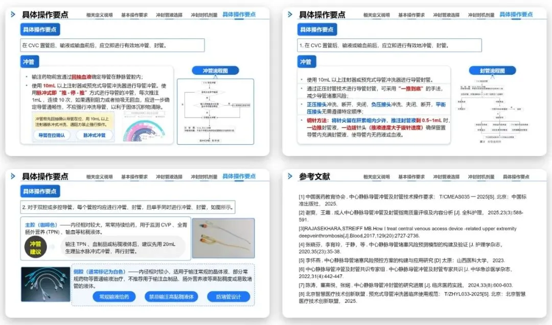 很多培训课件对封管液残留处理与管路使用前操作的讲解不全面,内容零散,导致护理人员对全流程规范掌握不完整,操作易出现偏差。