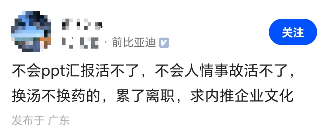 职场不公,总要有人站出来为职场发声,今天要给大家分享的是,最近看到脉脉上,一位前车企离职员工的吐槽,戳中了无数打工人的痛点:“不会PPT汇报活不了,不会人情世故活不了,换汤不换药的,累了离职,求内推企业文化好的企业。”