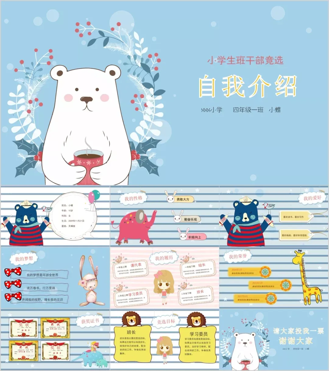 它包含46套日系文艺卡通和72套手绘可爱卡通,基本囊括所有的使用场景:开学典礼、小学班干竞选、家长会、儿童成长相册、六一活动、夏令营活动、教学说课等。