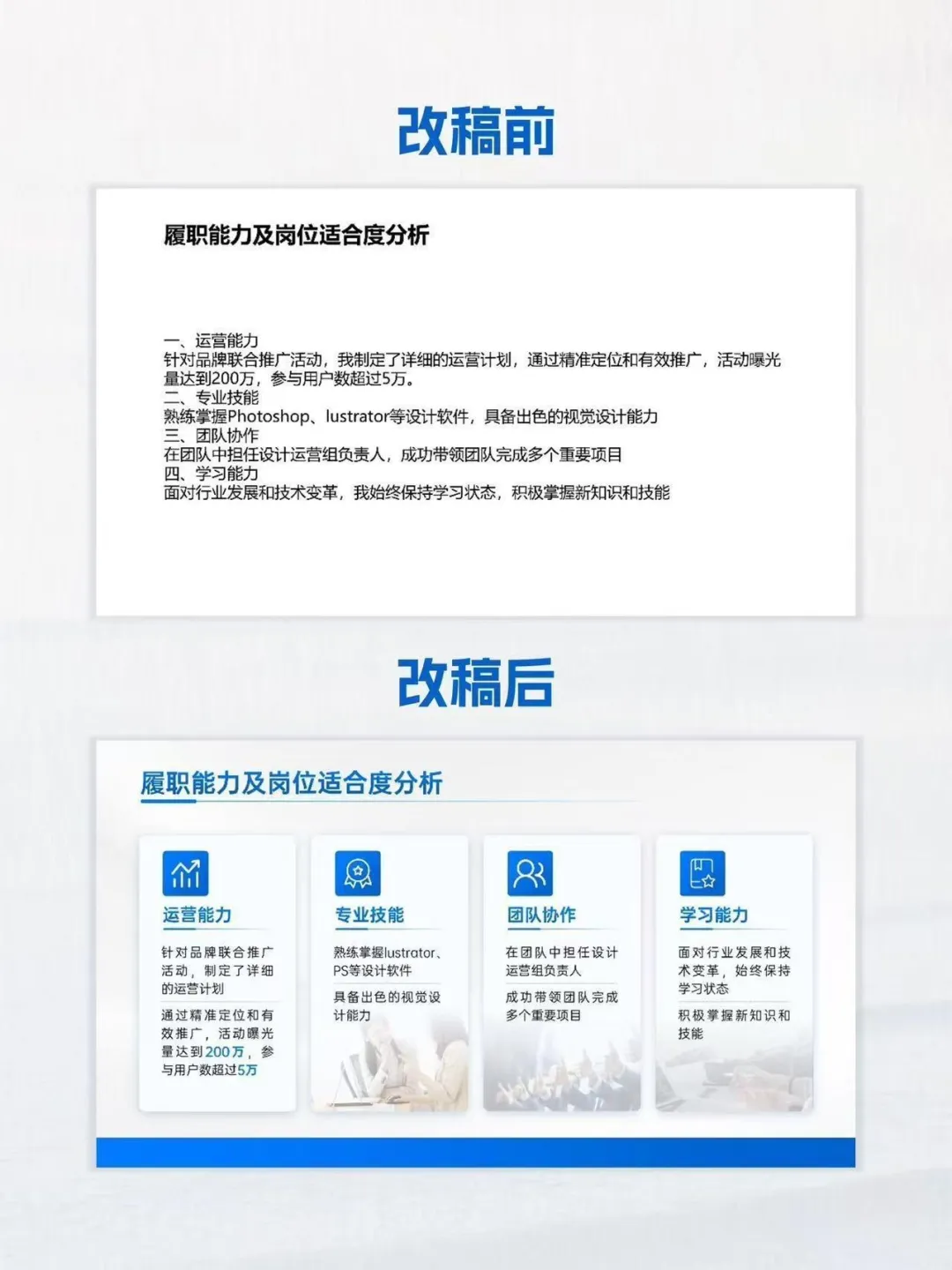 #ppt设计#述职汇报#ppt制作很多单位开始进行季度工作PPT汇报制作,有时候领导给的word文档,内容比较多,一边是有限的汇报时间,一边是密密麻麻的文字,这种情况下,ppt怎么做才能制作出高级感?遇到“汇报材料文字很多”的情况,做PPT的核心原则只有一个字:“捋”。捋什么?捋结构、捋层次、捋逻辑、捋内容。千万不要把汇报材料上面的文字一股脑的复制粘贴过来,PPT是可视化工具,PPT是为了演示,是需要根据文字提炼要点的逻辑表达,要让领导一眼就能看懂重点,而不是盯着密密麻麻的字念。✅第一步:捋(梳理)逻辑在制作之前,先通读一遍材料,拿起笔在纸上梳理出框架结构。整个汇报分哪几个板块,每个板块阐述什么内容,结构清晰了,制作出来的PPT才清晰、一目了然。✅第二步:捋(内容)瘦身有了逻辑后,开始处理具体文字。可遵循这些“删减原则”:一是试着做减法:删除形容词、删除连接词、删除解释性文字(如果不需要领导当场背诵,细节内容留在口头说,或者放在备注里。)二是学会做提炼:每页PPT只保留1个核心观点。把核心观点变成短句,控制在15-20个字以内,加粗放大。这样就避免了堆砌感。✅第三步:捋(视觉)转化(皮肤)当文字不可避免地还是有点多时,用设计手段来“修饰”文字的枯燥感。一是数据表格化/图表化如果是数字:千万别用文本罗列!立刻用柱状图、饼图、折线图。如果是对比:用左右分栏的表格,标出不同颜色的底色。二是关键词高亮法如果实在不能删减文字(比如政策宣读、标准汇报),那就保留文字,但改变排版。涉及到职场常见的述职汇报,岗位竞聘,季度总结,培训课件,公司介绍,很多人由于没时间做PPT、不会做PPT、不想做PPT,做不好PPT,都需要找人代做PPT帮做ppt,以及PPT制作美化服务。尤其针对汇报材料文字比较多的情况,学会这些PPT制作技巧,美化出来的PPT,清爽又高级。接ppt制作代做美化,年服务客户超300+,有ppt制作帮做需求,咨询下方图中二维码,内容保密,可开发票。