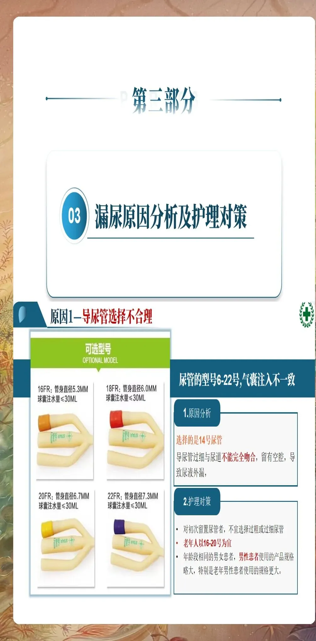 导尿管选择不当:导尿管型号选择是影响漏尿的重要因素。导尿管过小,与尿道贴合不紧密,容易出现间隙性漏尿;导尿管过大,对尿道黏膜刺激增加,容易引起尿道括约肌痉挛,导致漏尿。临床常见问题包括:未根据患者性别、年龄、体型选择合适型号的导尿管;未考虑患者的特殊病史(如尿道手术史、前列腺增生史等)。建议采用个体化导尿管选择策略,男性患者一般使用16-18号导尿管,女性患者一般使用14-16号导尿管,老年患者和前列腺增生患者可适当选择较大型号。