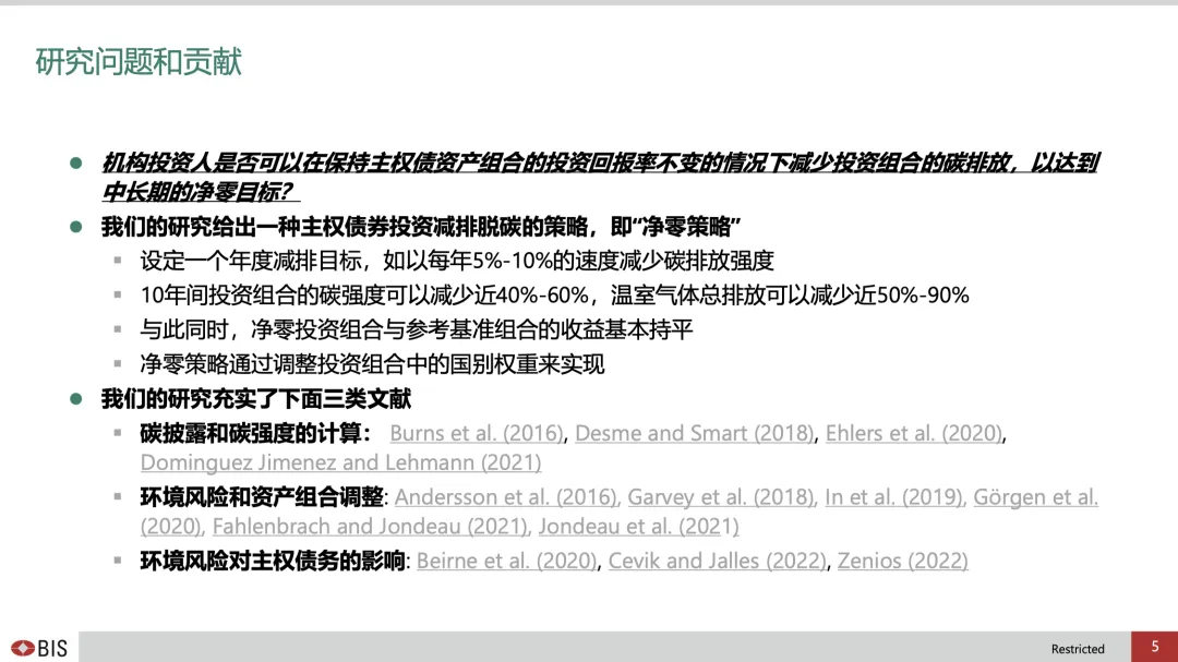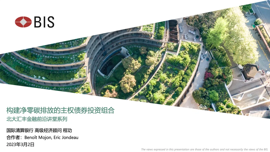 2023年3月2日晚,应北京大学汇丰金融研究院邀请,国际清算银行(BIS)高级经济顾问程功博士做客“北大汇丰金融前沿讲堂”,为大家带来主题为“构建净零碳排放的主权债券投资组合”的精彩讲座。程功博士探讨了投资者是否可以通过调整主权债券投资组合中的国别权重来降低整个投资组合的碳排放强度,从而达到“净零碳”的中期目标,并提出了通过调整投资组合中的国别权重来实现在不影响主权债券投资组合财务表现的前提下,以每年减少5%-10%的速度在十年间把投资组合的总碳强度降低40%至60%的投资方案。