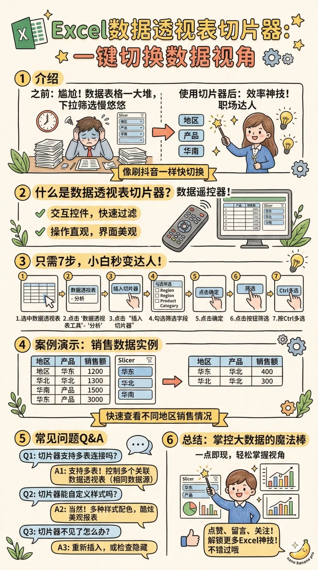 数据透视表切片器是Excel的一个交互控件,专门用来过滤和切换数据透视表中的分类字段;操作直观,界面美观,支持多选,超级方便!