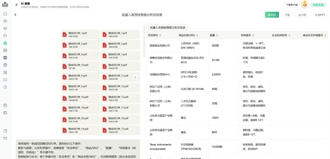 ChatExcel 比较特别的一点是,它不是等你把素材都整理好了,才开始帮你做 PPT。你可以直接把 Word、Excel、PDF,甚至图片丢进去,它会先帮你读内容:比如提取 Word 的结构、分析 Excel 里的数据并生成图表、尽量还原 PDF 里的图文信息,然后再往 PPT 这一步走。