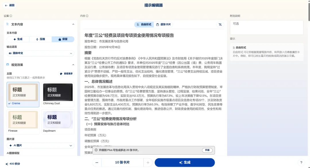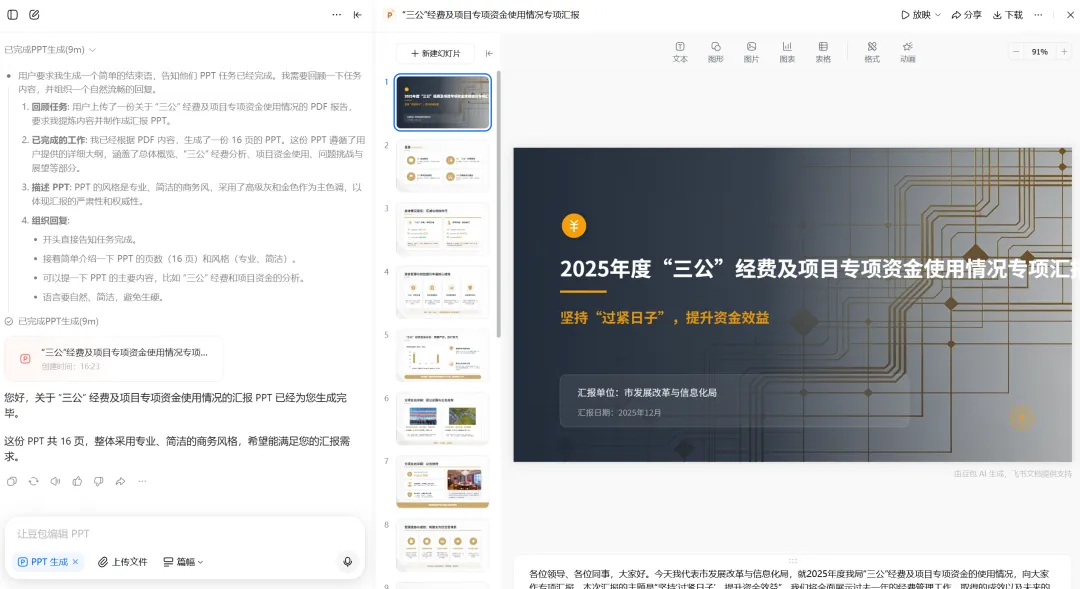 豆包的优势则更偏“先把内容压出来”。 如果你的输入本身是一篇很长的材料,或者是一份信息量比较大的文档,豆包比较适合先帮你抓重点、压缩信息,再整理成适合展示的页面结构。它更像是先把复杂内容变得更适合讲,再进入 PPT 这一步。