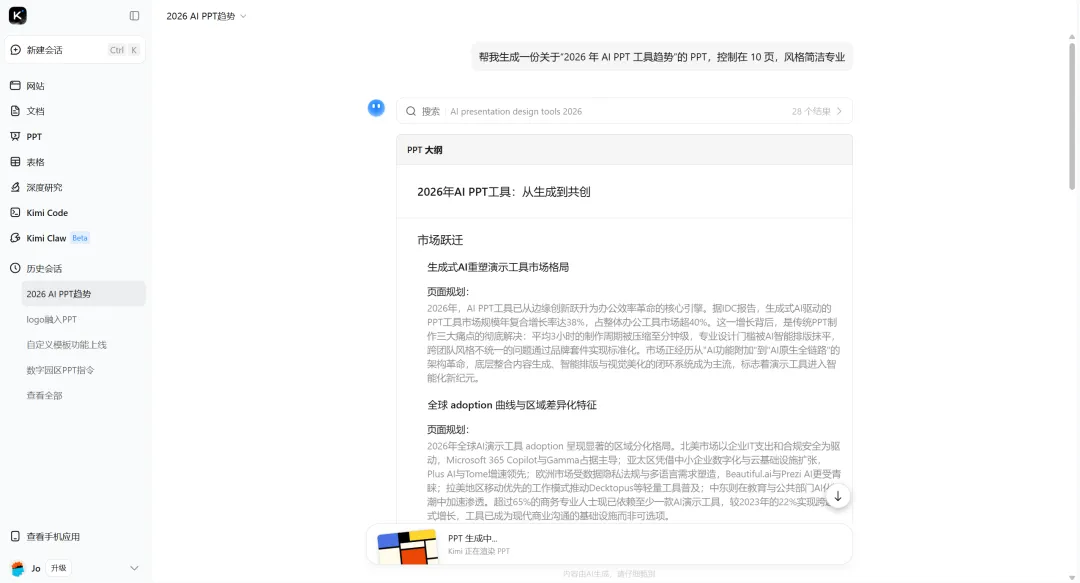 当资料消化完,才真正进入很多人理解中的“AI 做 PPT”:先给我一个大纲,再把每一页的标题和文案写出来。这一阶段,比较值得讲的是 Kimi、豆包和 Gamma,因为它们刚好代表了三种常见需求:中文内容生成、长材料压缩,以及快速成稿。