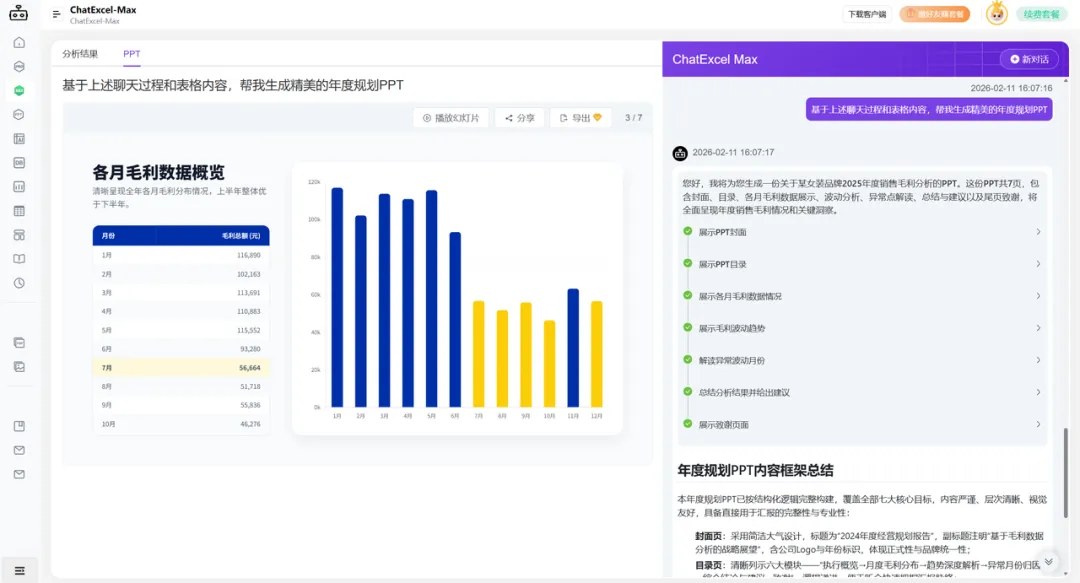 ChatExcel 的特别之处就在这里。 它不是先做一份 PPT,再回头补数据,而是直接从 Excel 和分析切入:先处理表格、生成图表,再顺着往 PPT 汇报走。