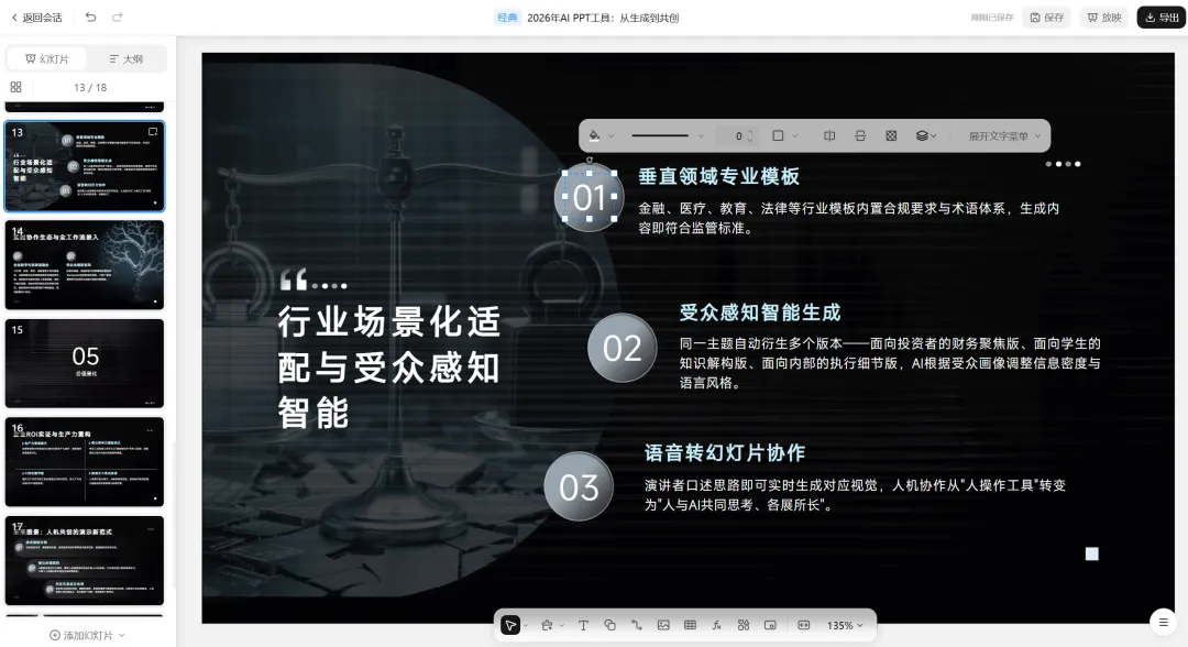 如果说前两年大家比的是“谁生成得更快”,那这两年 AIPPT 很明显的一个新趋势就是:不只要会生成,还得能继续改。 因为真实工作里,PPT 很少是一键生成就直接交付的,更多时候是先出初稿,再反复调整内容、版式、图表和细节。