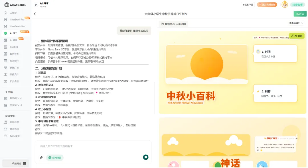 也就是说,ChatExcel 不只是后面负责“做图表”或“生成页面”的工具,而是从一开始整理内容的时候就能介入。像月报、销售复盘、经营分析这种本来就有很多表格和业务信息的场景,它往往比那些纯套模板的 AI PPT 工具更早进入状态。