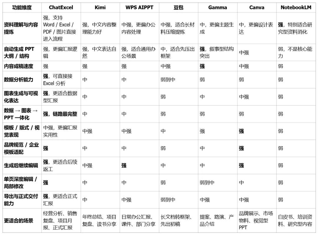 ChatExcel 的优势就在这里。从你整理的表格来看,它在自定义母版、企业模板适配、1:1 完整导出、可编辑导出、单页深度编辑、局部修改不影响整体版式这些点上,都是更明确、也更系统的。也就是说,它不是把 PPT 当成一个孤立终点,而是把内容理解、数据分析、图表生成、结构整理和最终汇报放在同一条链路里。
