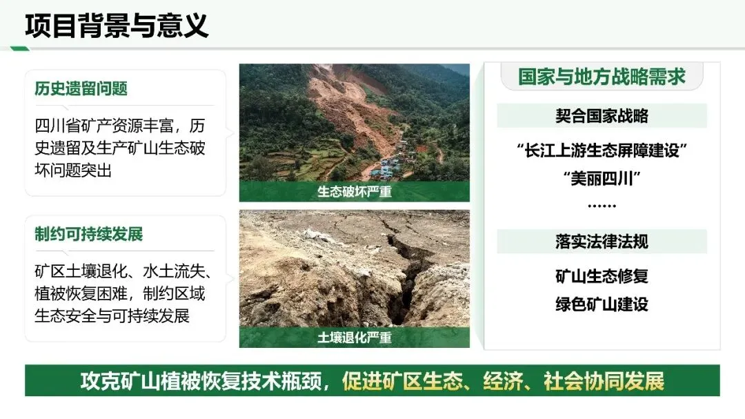 紧扣长江上游生态屏障建设、绿色矿山发展等国家与地方战略,针对四川矿山历史遗留生态破坏、土壤退化等突出问题,在江西省科奖答辩 PPT 中凸显项目破解矿山植被恢复技术瓶颈、推动矿区生态经济社会协同发展的重要意义,体现科研服务生态文明建设的使命担当。