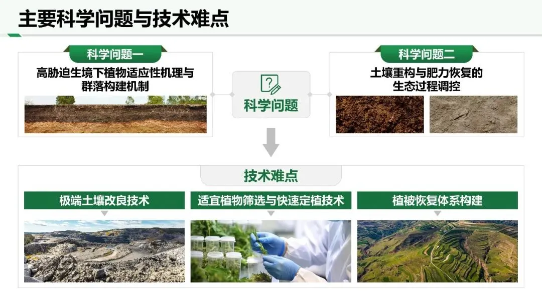 在答辩 PPT 中精准梳理高胁迫生境植物适应机理、土壤重构肥力调控两大科学问题,以及极端土壤改良、适生植物筛选、植被体系构建等技术难点,展现对行业痛点的深刻把握,为科奖、江西省科奖申报奠定扎实的问题导向基础。