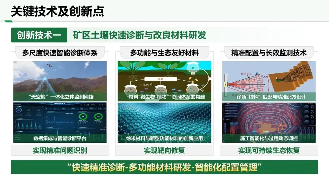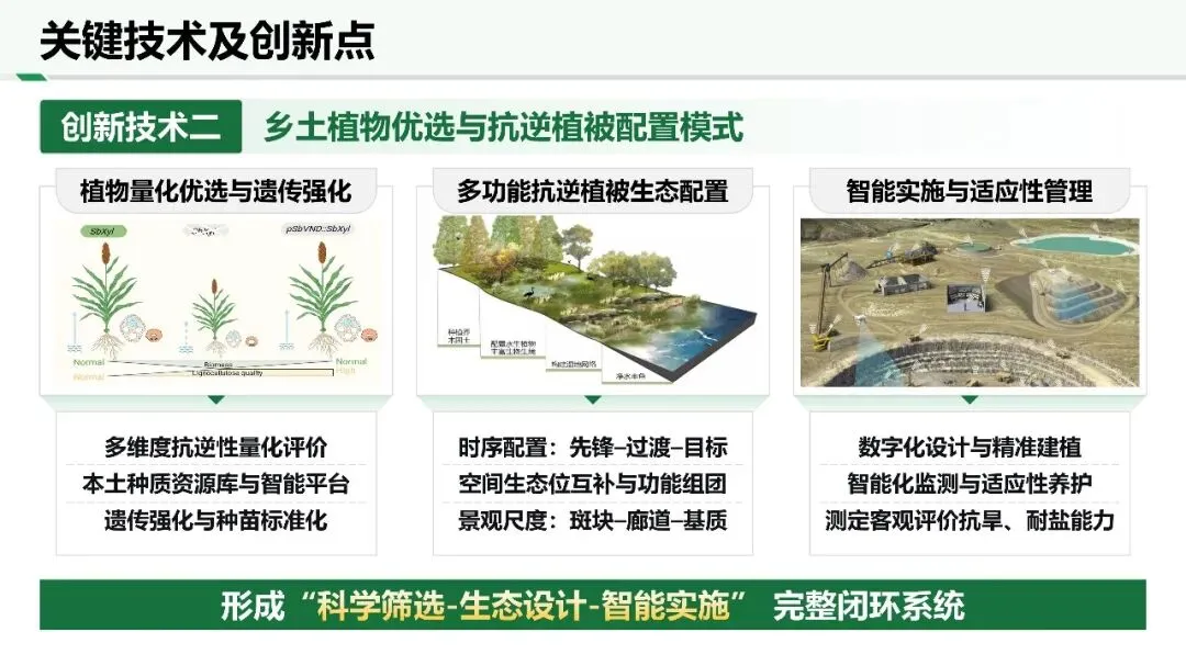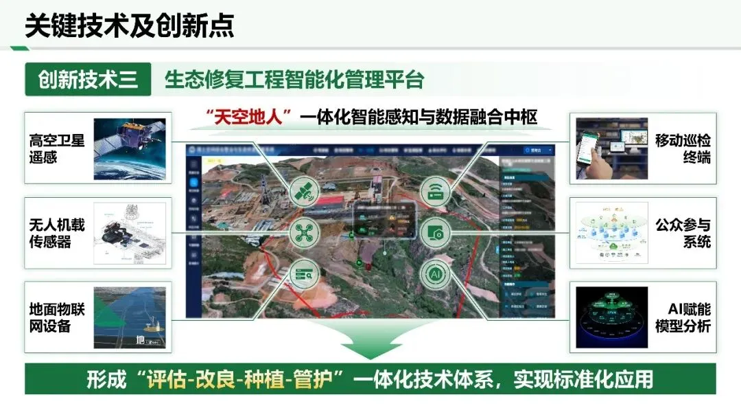 创新构建乡土植物优选与抗逆植被配置模式,形成 “科学筛选 - 生态设计 - 智能实施” 完整闭环;搭建 “天空地人” 一体化生态修复智能化管理平台,打造 “评估 - 改良 - 种植 - 管护” 全链条技术体系,在科奖、江西省科奖答辩 PPT 中直观呈现技术原创性与工程化成效,彰显科研团队的技术引领与成果落地能力。