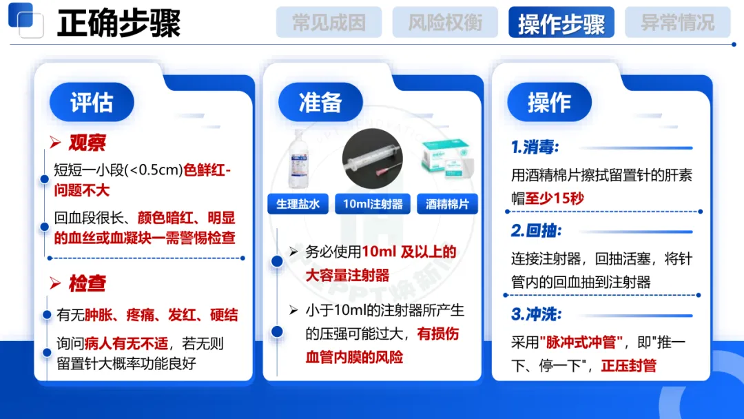 见回血,莫慌张。先评估,后准备。要回抽,再脉冲。阻力大,立即停🚫。